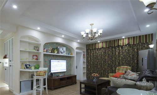 在這古典高雅的客廳中,體現出一種歐式田園風格的氣息,客廳中采用簡約白色沙發為主,搭配實木質茶幾桌,地面又采用仿古式瓷磚拼花設計,給人一種復古的味道。電視背景墻采用的是黑色瓷磚正方格子設計,在客廳中顯得非常突出,深受人們的喜愛。
