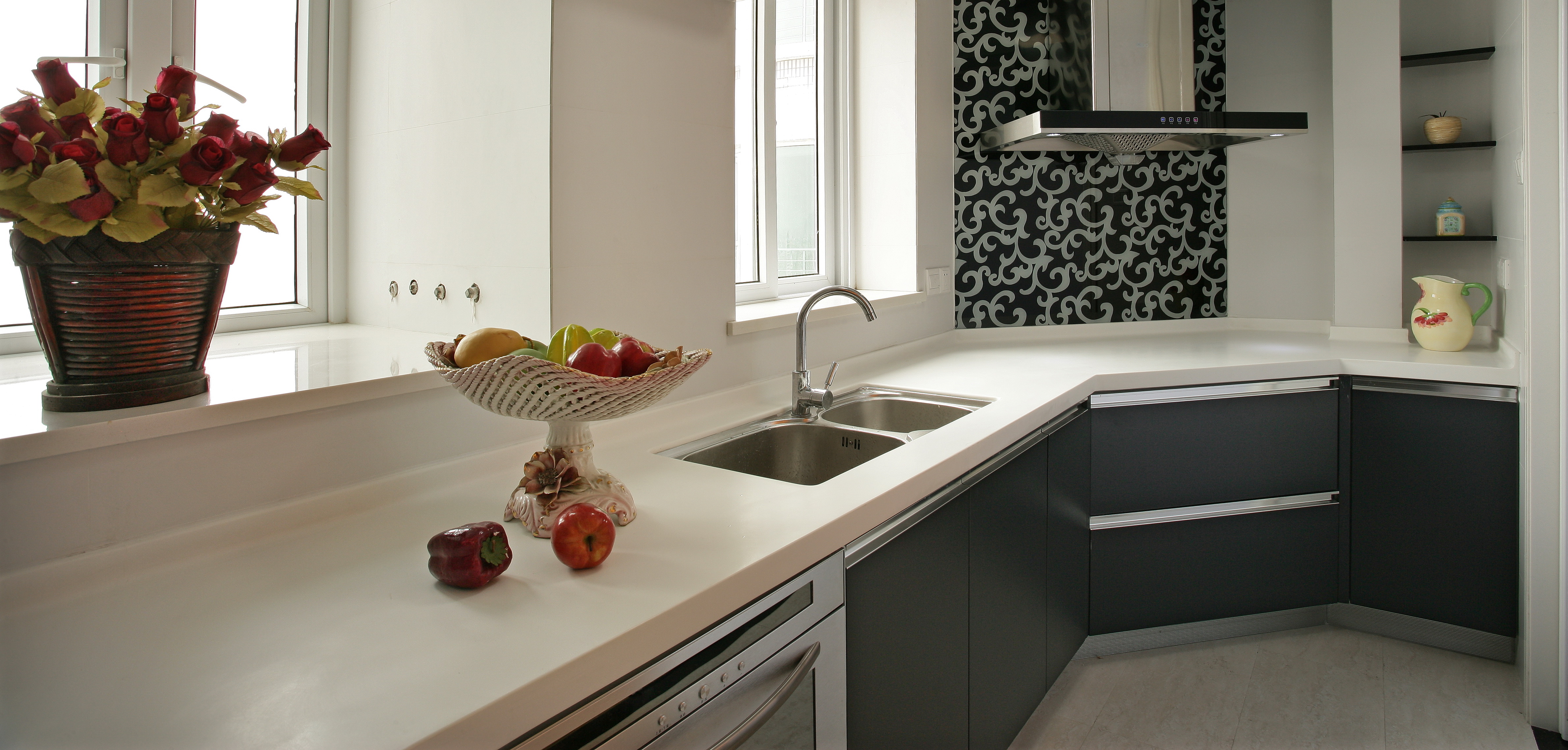 石英石的石英含量高達93%,其表面硬度可高達莫氏硬度7,大于廚房中所使用的刀鏟等利器,不會被其刮傷;對廚房的酸堿等有極好的抗腐蝕能力,日常使用的液體物質不會滲透其內部,易清潔,無需特別保養。