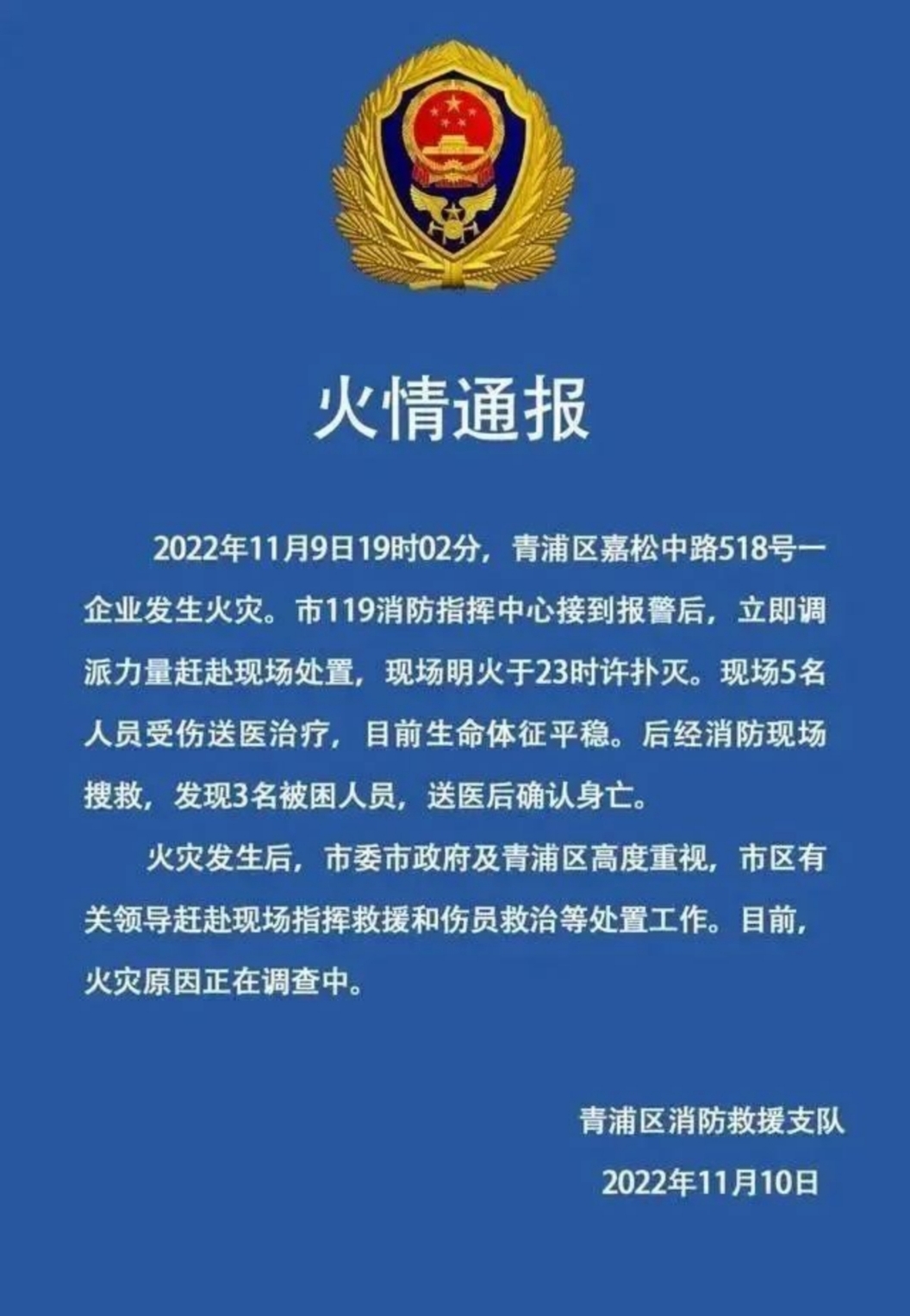 火災(zāi)發(fā)生后,上海市委市政府及青浦區(qū)高度重視,市區(qū)有關(guān)領(lǐng)導(dǎo)趕赴現(xiàn)場(chǎng)指揮救援和傷員救治等處置工作。目前,火災(zāi)原因正在調(diào)查中。