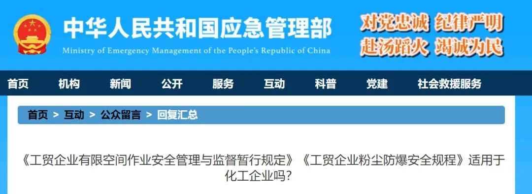 回復(fù): 感謝您的留言。《工貿(mào)企業(yè)有限空間作業(yè)安全管理與監(jiān)督暫行規(guī)定》(國家安全監(jiān)管總局令第59號)《工貿(mào)企業(yè)粉塵防爆安全規(guī)程》(應(yīng)急管理部令第6號)均不適用于化工企業(yè)。回復(fù)單位: 安全執(zhí)法和工貿(mào)監(jiān)管局 回復(fù)時(shí)間: 2021-09-29
