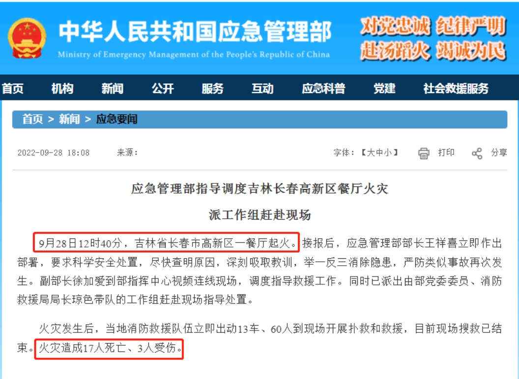 據@應急管理部 消息,9月28日12時40分,吉林省長春市高新區一餐廳起火。接報后,應急管理部部長王祥喜立即作出部署,要求科學安全處置,盡快查明原因,深刻吸取教訓,舉一反三消除隱患,嚴防類似事故再次發生。副部長徐加愛到部指揮中心視頻連線現場,調度指導救援工作。同時已派出由部黨委委員、消防救援局局長瓊色帶隊的工作組趕赴現場指導處置?;馂陌l生后,當地消防救援隊伍立即出動13車、60人到現場開展撲救和救援,目前現場搜救已結束。火災造成17人死亡、3人受傷。