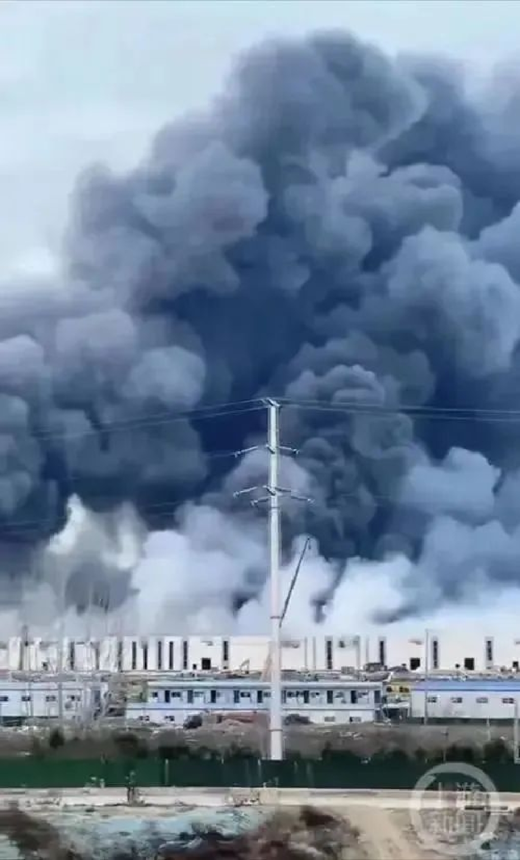工地起火后,廠區(qū)上空彌漫著大量黑煙,現(xiàn)場還有大量濃煙從廠房中竄出。