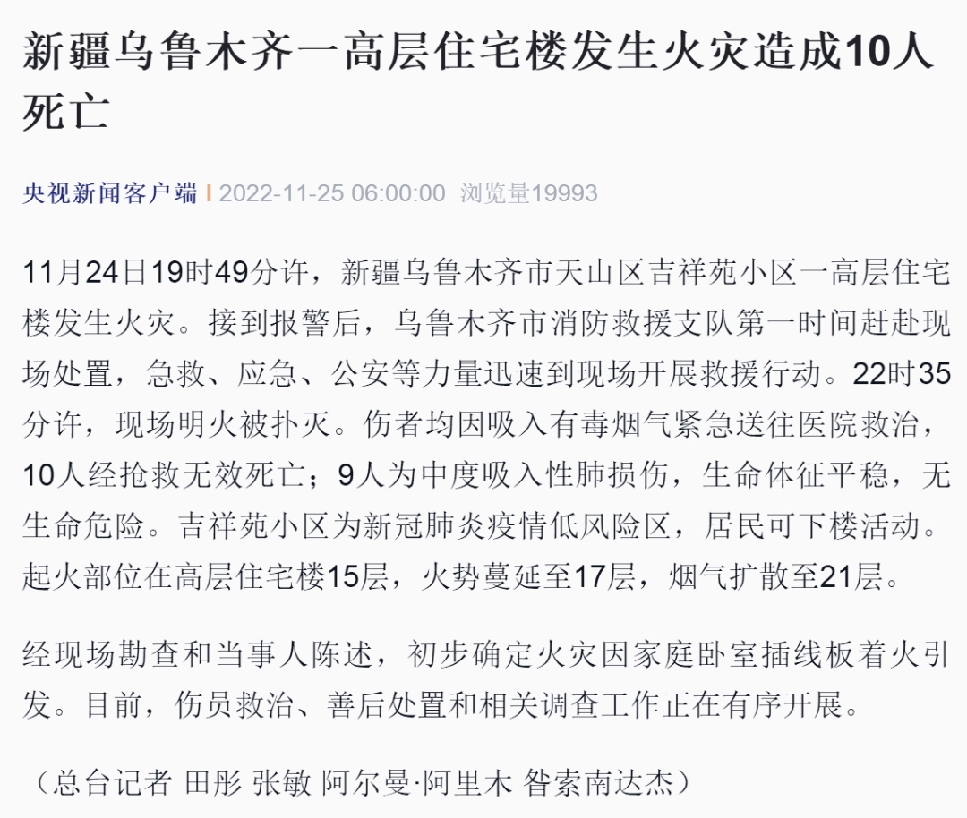 突發(fā)!10死9傷!烏魯木齊一高層發(fā)生火災(zāi)