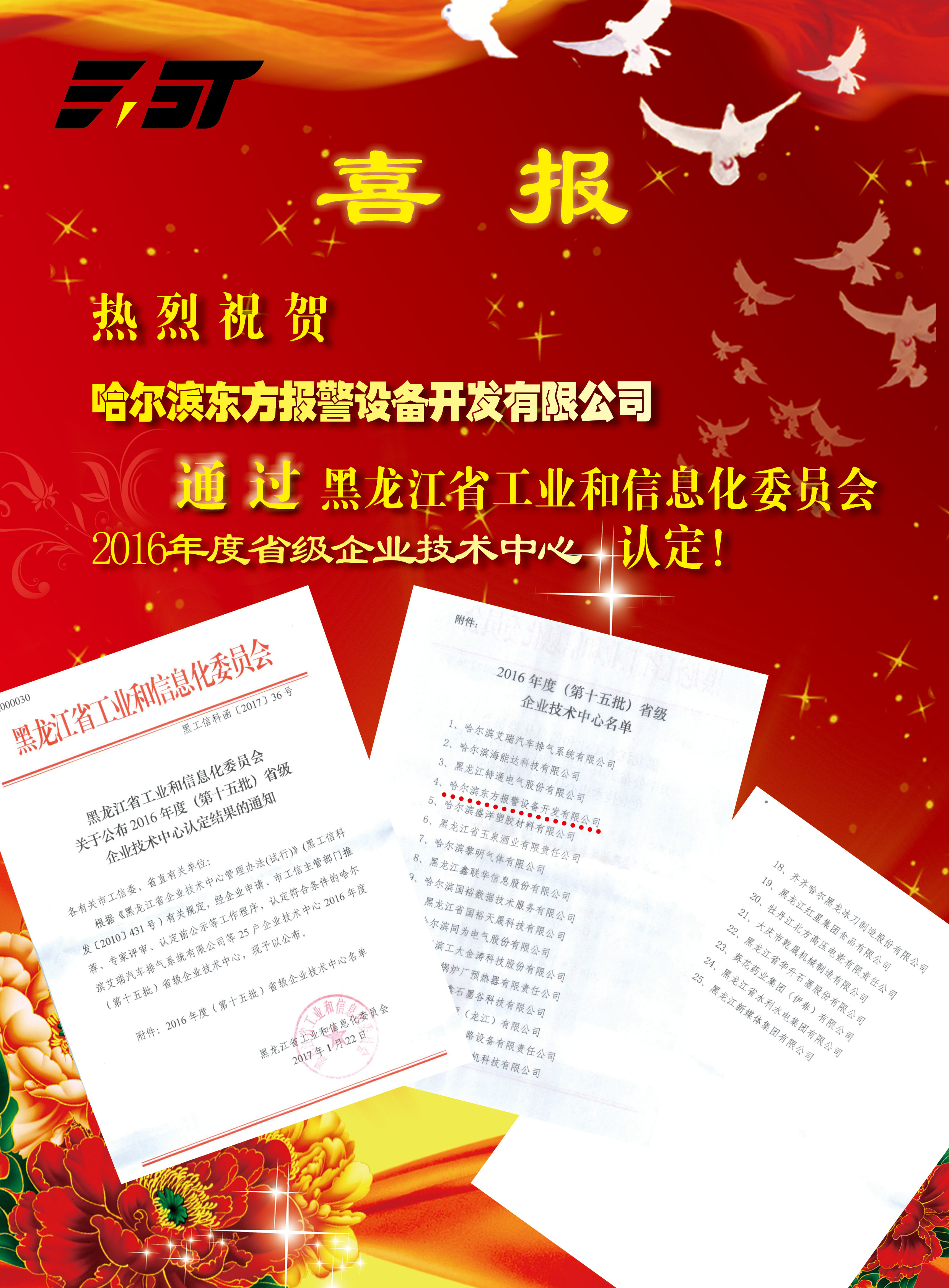 東方報(bào)警通過黑龍江省工業(yè)和信息化委員會(huì)2016年度省級(jí)企業(yè)技術(shù)中心認(rèn)定!