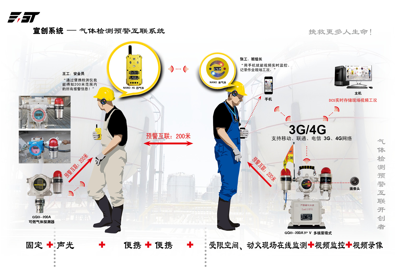 固定式探測器+無線聲光+便攜+便攜+受限空間、動火現場預警互聯、視頻監控、視頻存儲