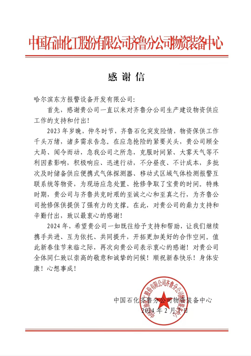 歲末年初,東方報警收到中國石油化工股份有限公司齊魯分公司物資裝備中心的感謝信,對我公司的支援工作給予高度評價。