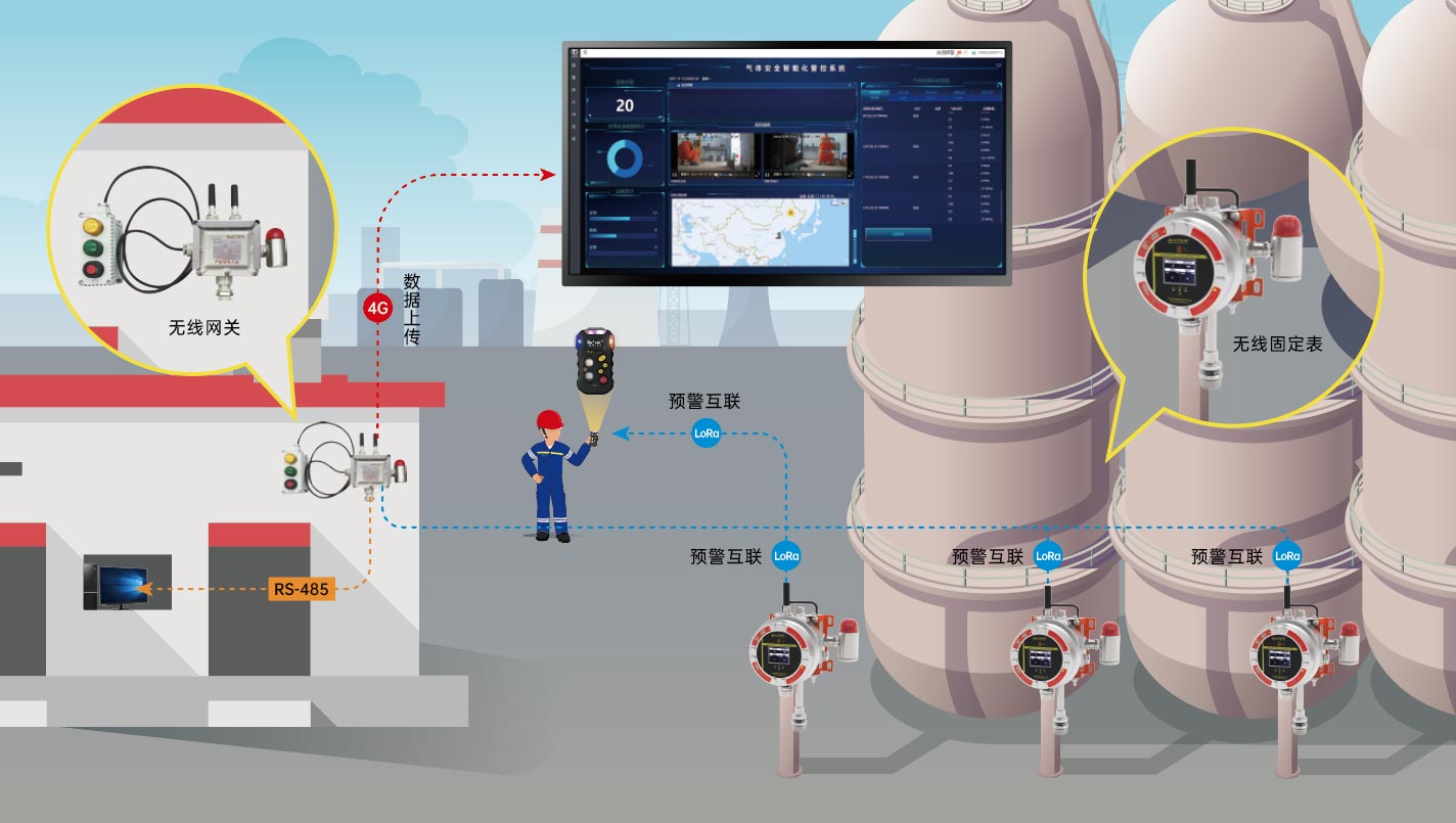 無布線條件氣體監測一般都是監測范圍廣、布線難度大的區域。采用無線固定表加無線網關的方式,無線固定表適用于油庫、加油站、油田井下修井作業隊、管道等野外作業區、罐頂監測等環境,無需供電、布線,安裝即用,超長待機時間可達6個月,可同時檢測可燃及有毒氣體;配合無線網關可實現數據無線傳輸,網關支持數據RS485上傳至控制室,同時支持4G無線上傳至氣體安全智能化管控系統。